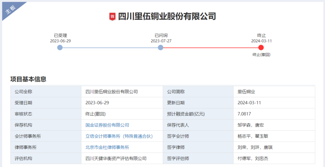3月11日,深交所官网显示,因四川里伍铜业股份有限公司(以下简称:里伍铜业)以及保荐机构国金证券撤回发行上市申请,根据《深圳证券交易所股票发行上市审核规则》第六十二条的有关规定,深交所决定终止对里伍铜业首次公开发行股票并在主板上市的审核。里伍铜业IPO申报于2023年6月29日受理,同年7月27日深交所向其发出第1轮审核问询函,截至终止未见公布首轮问询的回复。这并非里伍铜业首次冲刺IPO,早在2014年里伍铜业就在证监会披露了招股说明书,拟在深交所挂牌。2016年09月21日证监会因里伍铜业存在相关事项需要进一步落实,取消了第139次主板发审委会议。时隔半年,2017年04月10日,证监会再次对里伍铜业进行首发审核,结果未获通过。
