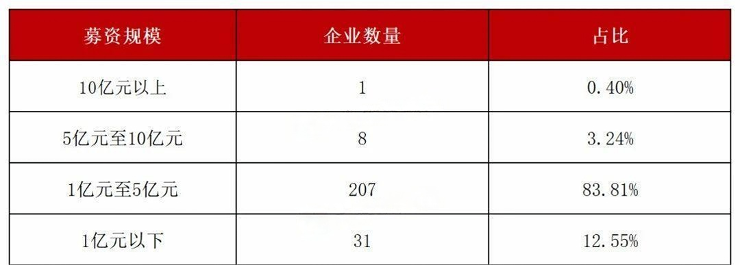 募集资金在1亿元至5亿元的有207家,占比83.81%;