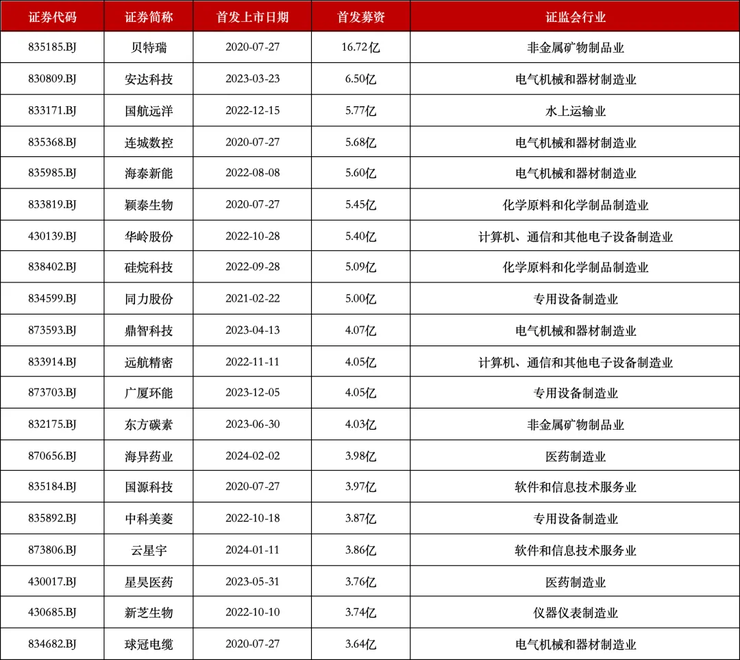 分区间来看,募资金额超10亿元的仅有1家,为贝瑞特,首发募资16.72元;