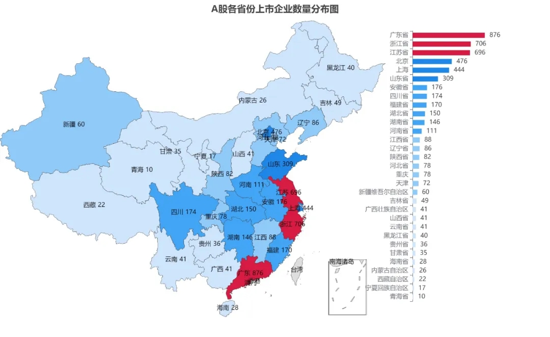 浙江和江苏A股上市公司数量分别达到706家、696家,跟广东组成头部阵营,这三个经济大省独占全国A股上市公司超四成份额,具体情况如下: