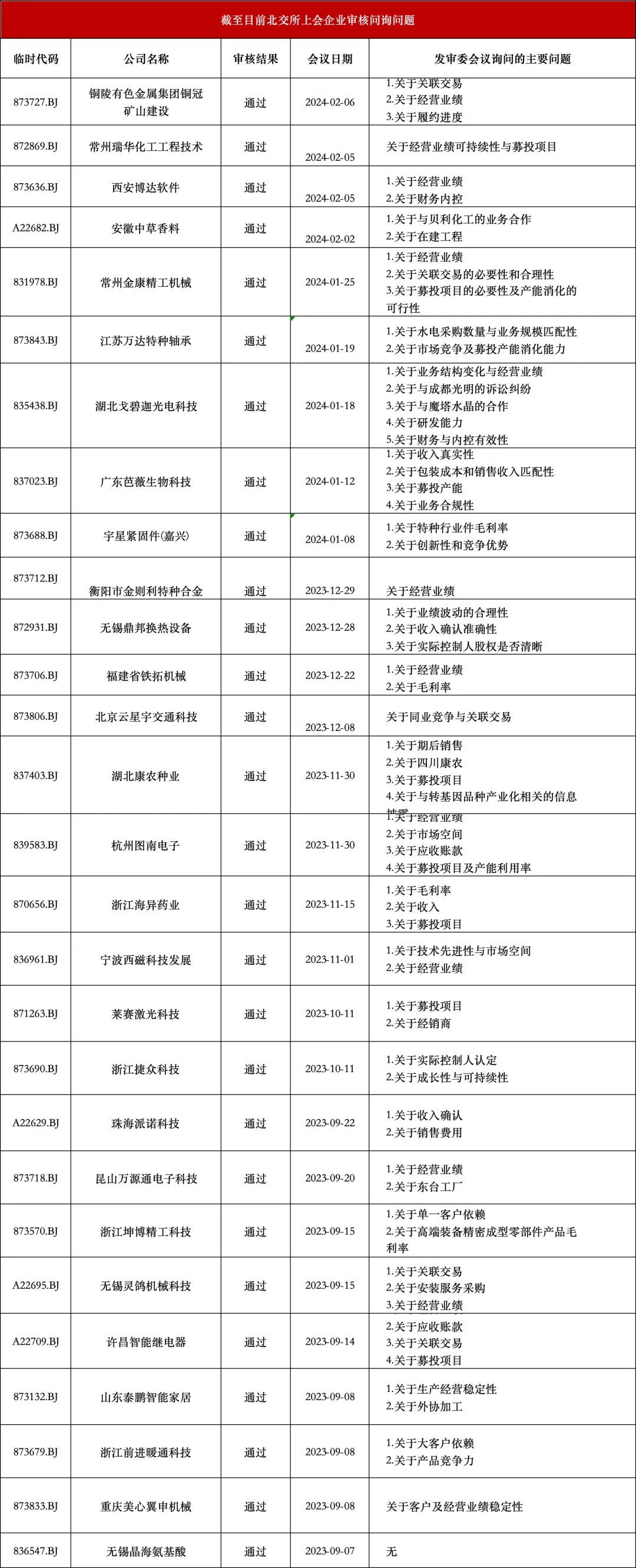 以下是77家北交所上会企业的审核问询问题要点汇总表: